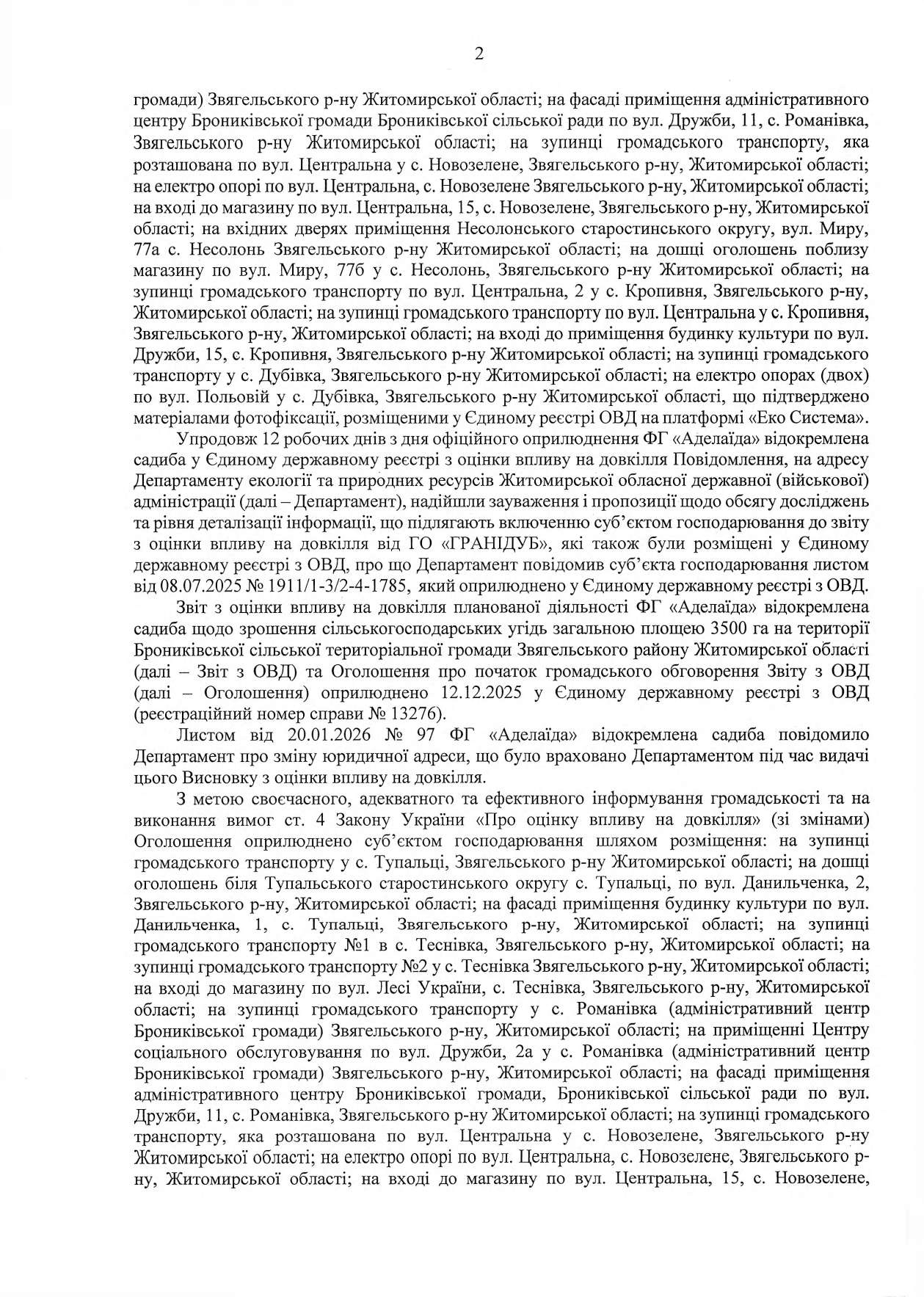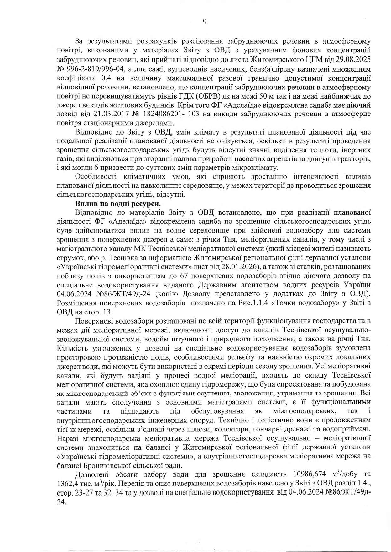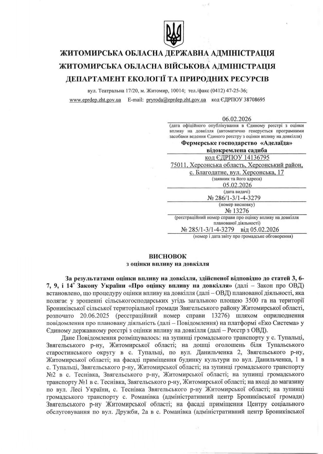 Раді повідомити важливу новину для нашого фермерського господарства: у лютому цього року ФГ «Аделаїда» отримало висновок з оцінки впливу на довкілля для планованої діяльності із здійснення зрошення на території нашої Житомирської філії.